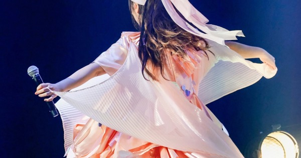 セッションが終わると、ステージ2階部分からラグジュアリーな衣装をまとったコレサワが登場。淡いピンクのロングワンピースはフリルが何層にも重ねられ、裾部分に散りばめられたハートの装飾が動くたびにキラキラと揺れ輝く。