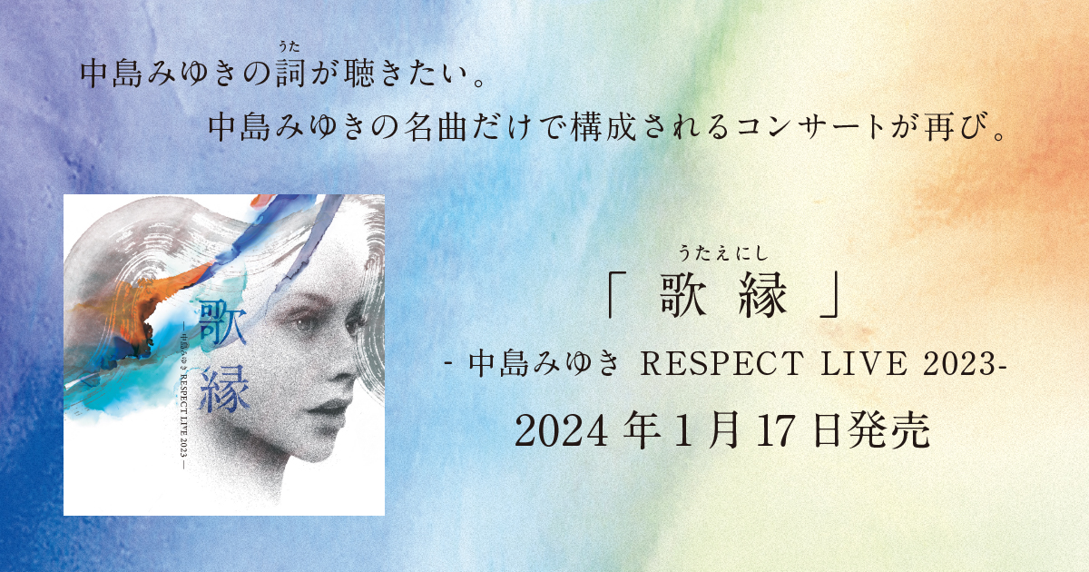 そして山本彩、ハンバート ハンバート、半﨑美子、仲宗根泉(HY)、一青窈、斉藤由貴、曽我部恵一(サニーデイ・サービス)、増田惠子、德永英明(*収録順)が大阪、東京のステージで豪華アーティストが中島みゆきの名曲を歌いあげたカバー・ライブCD『歌縁』第2弾『「歌縁」(うたえにし)‐中島みゆき RESPECT LIVE 2023-』もリリースされている。